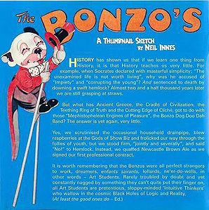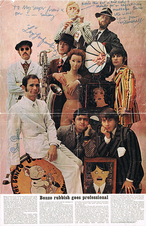 There are several sites dedicated to the Bonzo Dog Doo Dah band, some of which are excellent resources for historical information, lyrics, tour dates etc so I won't be adding to that information at all - but see the links at the bottom of the page for more information. Instead I will only be showing Bonzo Dog Doo Dah Band images that include Bonzo!