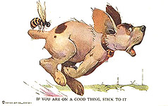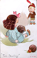 An unusual set of 12 cards, issued in the 1910 period. The cards are apparently signed G.E. Sim, however, on closer inspection the artist name is an overprint of the G.E. Studdy signature and can be clearly seen on a couple of the cards - the style is pretty unmistakeable though!