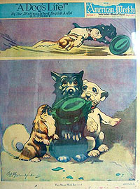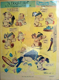 Bonzo appeared regularly in newspaper cartoon and comic sections. A long-running series was seen in the American Weekly Sunday supplement and went under the title "A Dog's Life". The first in the series came on December 17th 1922, after which there was no stopping him - some further examples are shown below. The cartoons were all broadsheet posters, if it weren't for the fact they were printed on newspaper they would be priceless!